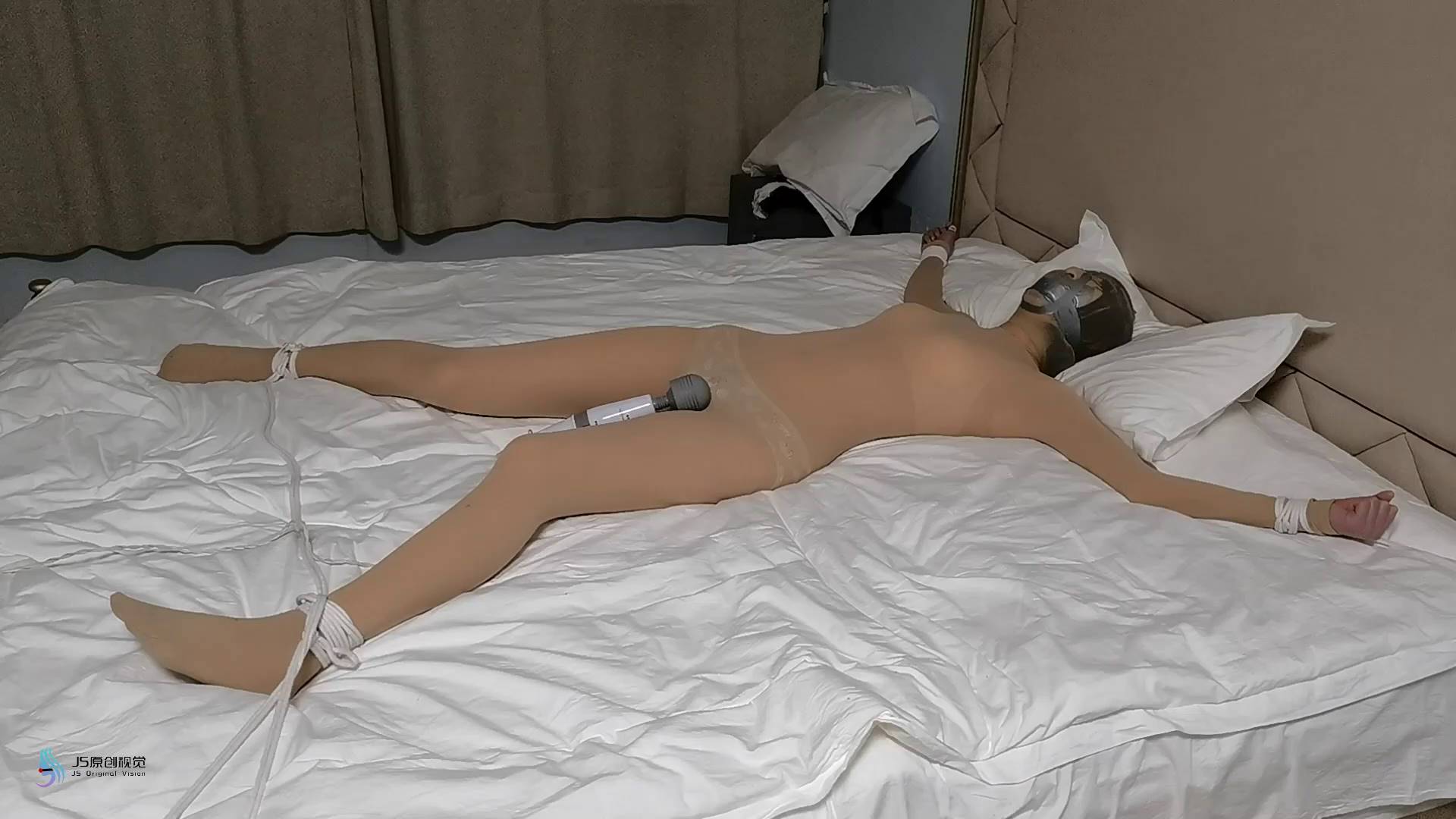 JS原创 欣妍肉丝连体衣大字绑玩足原味棉袜塞嘴丝袜套头胶带封堵双棒齐震