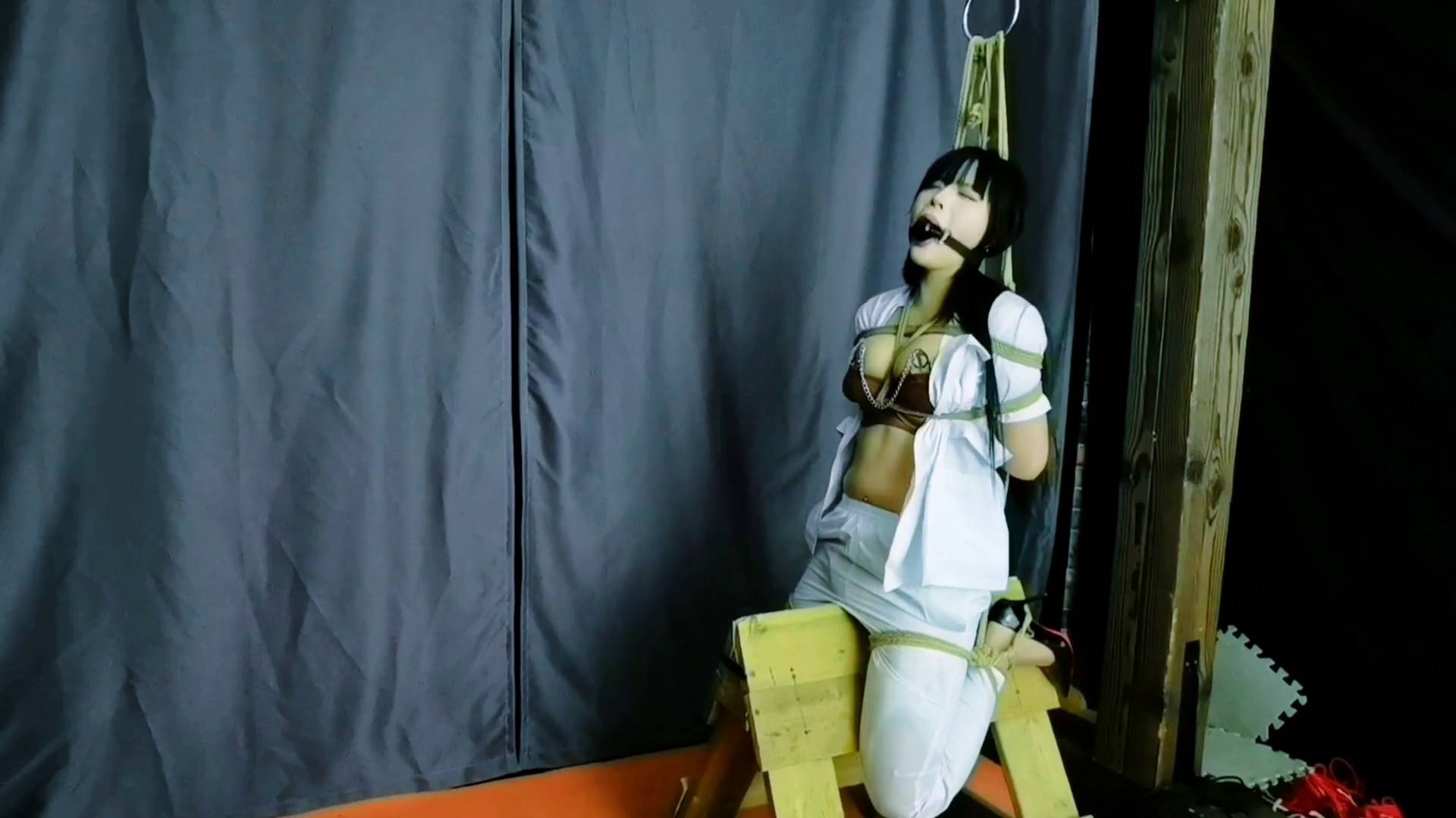 飞天原创 女护士曼妮今天没看黄厉走错了门被蒙面人打晕后吊绑在尖棱的木马上