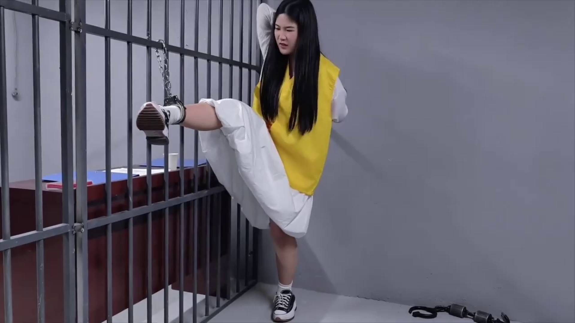 忘忧社 新模特小艾云思饰演女毒贩和杀人犯,被逮捕后还不老实,于是先踮起脚来拷上,到监狱后又苏秦背剑铐起来...