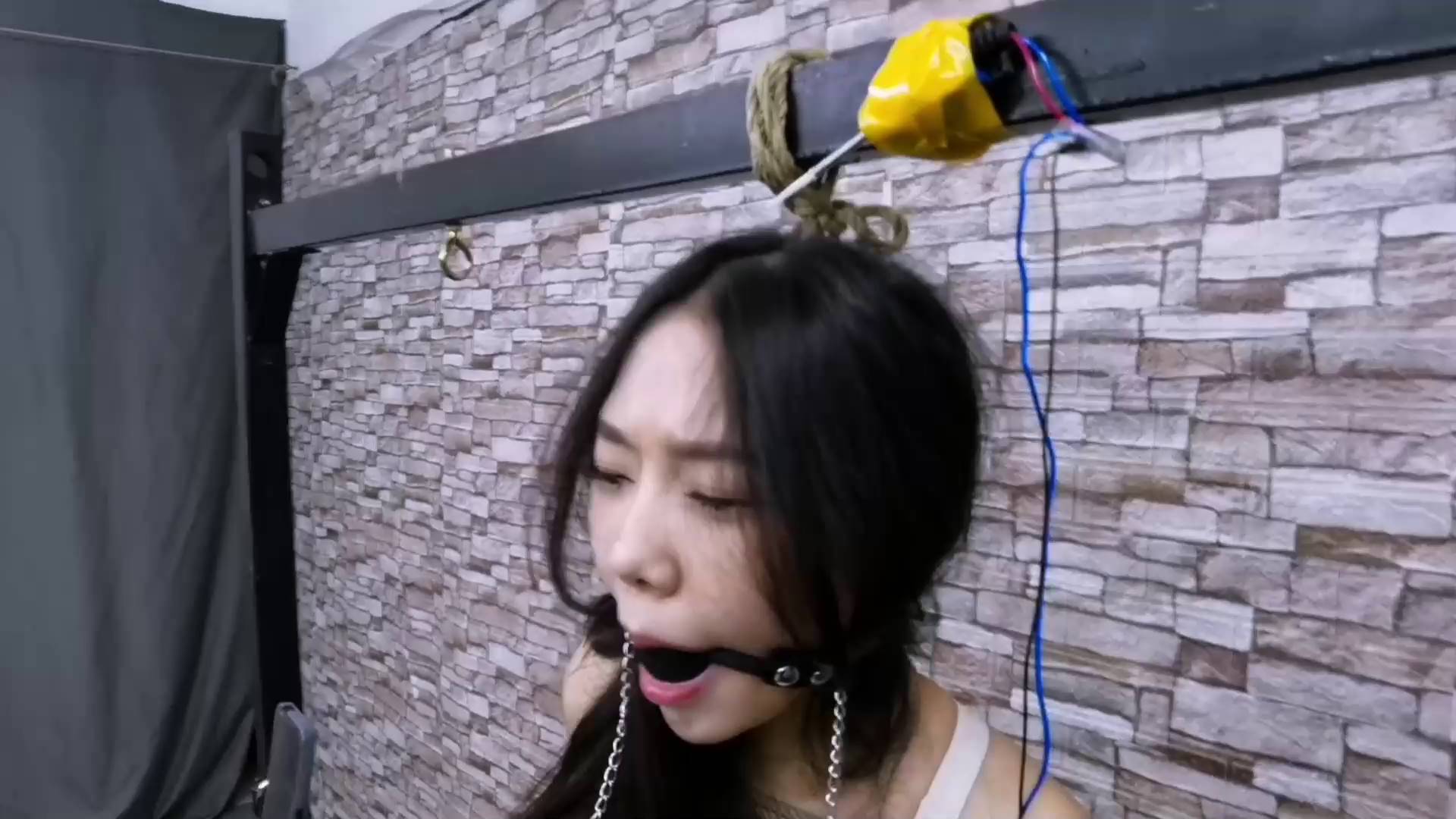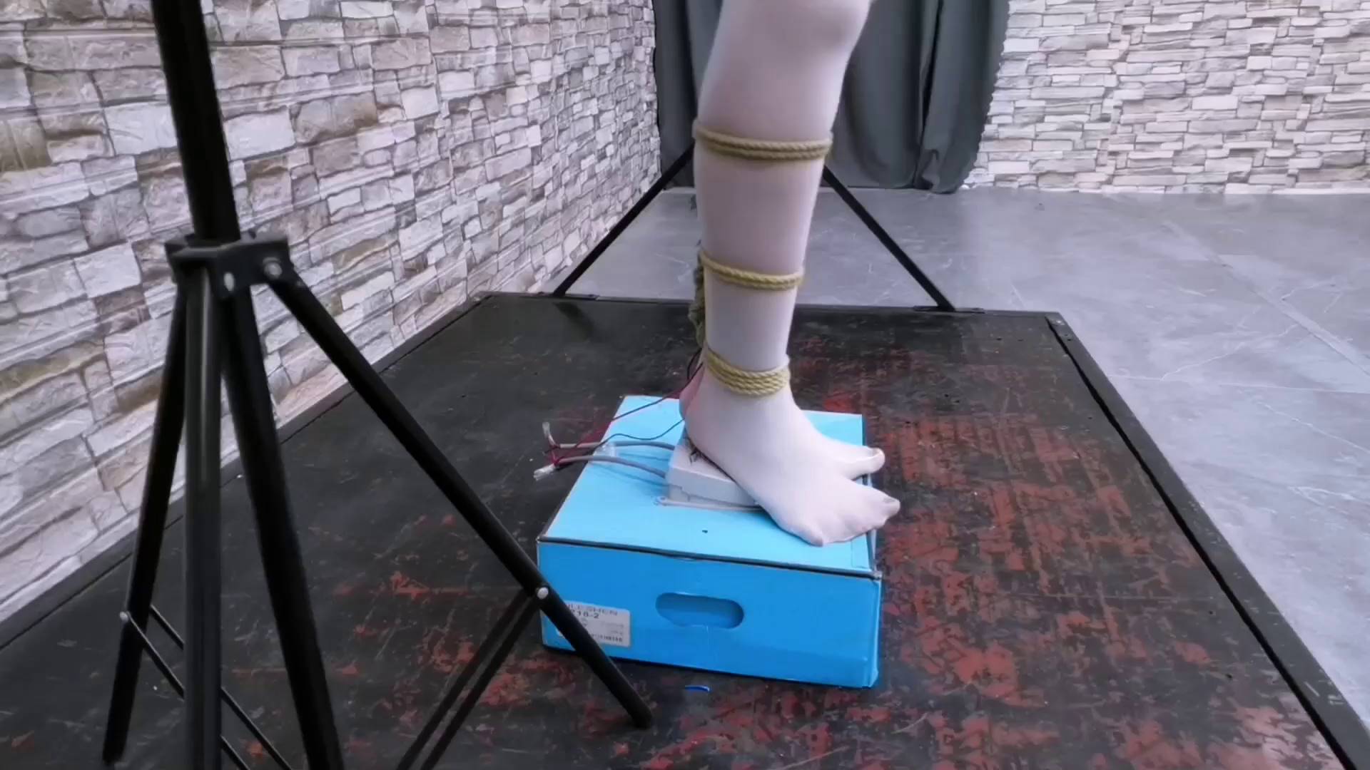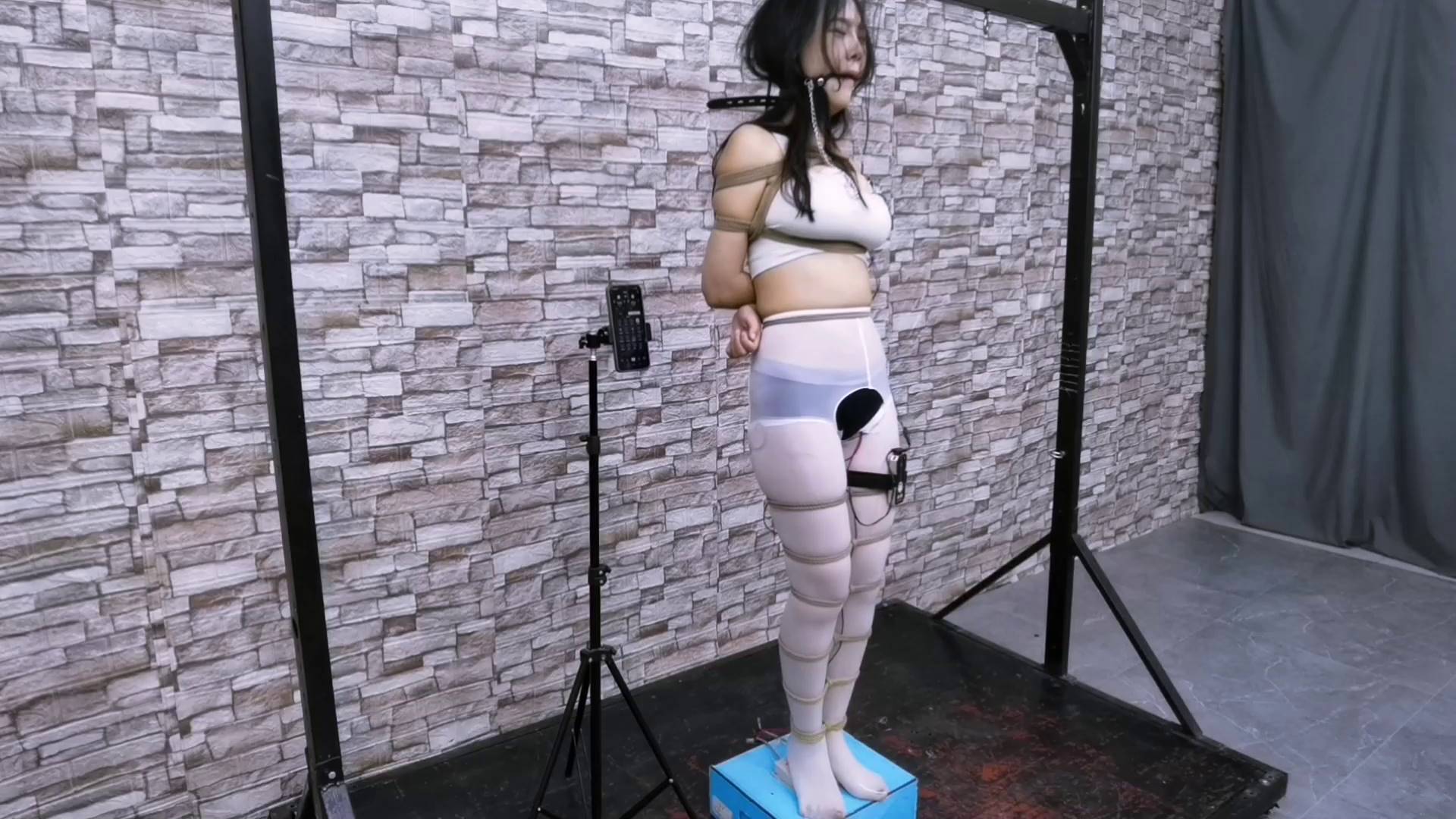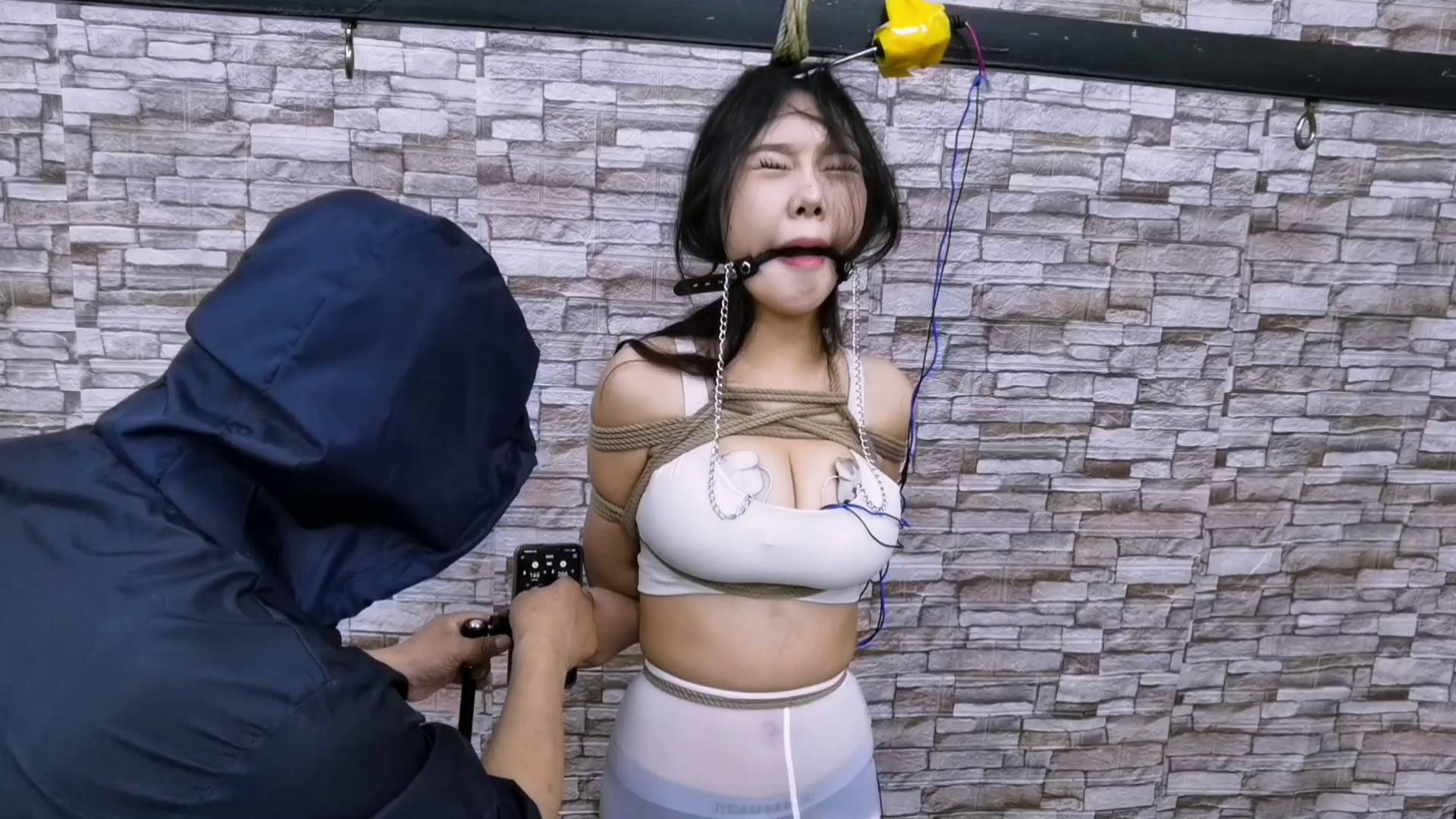 飞天原创 将女骗子绳捆索绑直立吊起来,脚底按了个脚踏开关,头顶按了个360激活开关串联于郊狼电击,上下自动电击,到...
