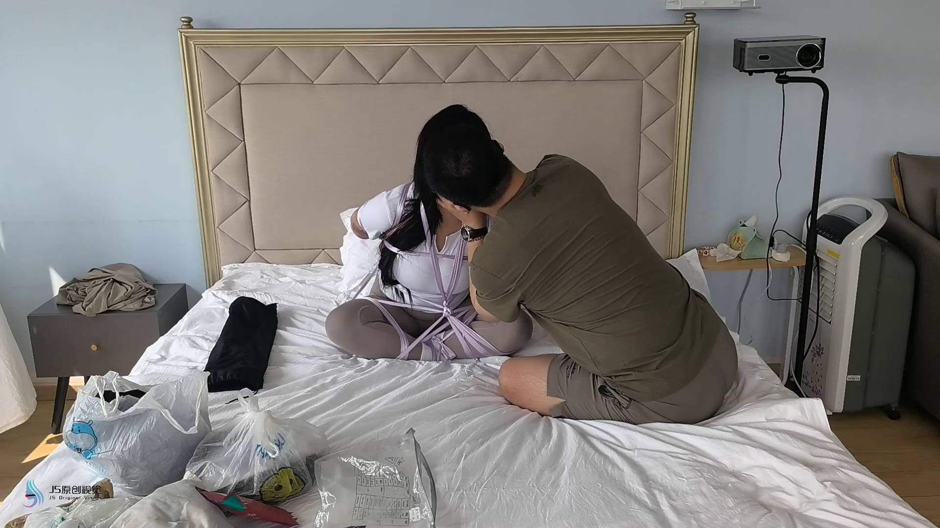 JS原创 曼妮紧身瑜伽服丝绸团缚白袜毛巾塞嘴超粘胶布鞭打恋足棒棒刺激